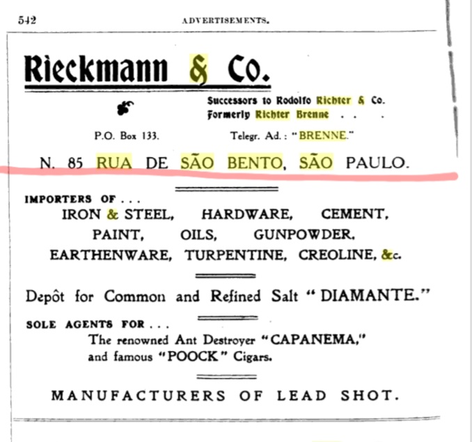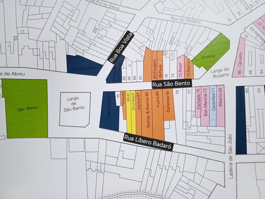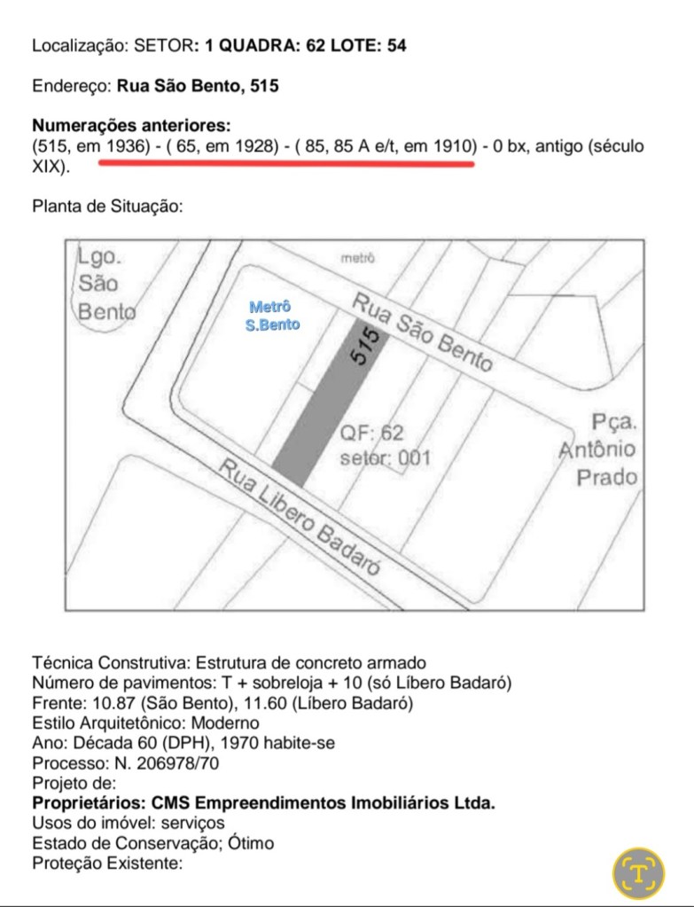 Interessado em saber onde estaria localizado atualmente o antigo número 85, visitei a Rua São Bento por diversas vezes com informações desencontradas . Então, resolvi recorrer ao Acervo do Arquivo Histórico Municipal em março de 2020 para consultar os livros de Emplacamento. A numeração dos imóveis sofreu alterações nas primeiras décadas do século XX devido às mudanças do “Marco Zero da Capital” e o sistema de medição dos imóveis em relação ao início da Rua. Finalmente encontrei a sequência das alterações, resultando enfim ao atual Número 515.