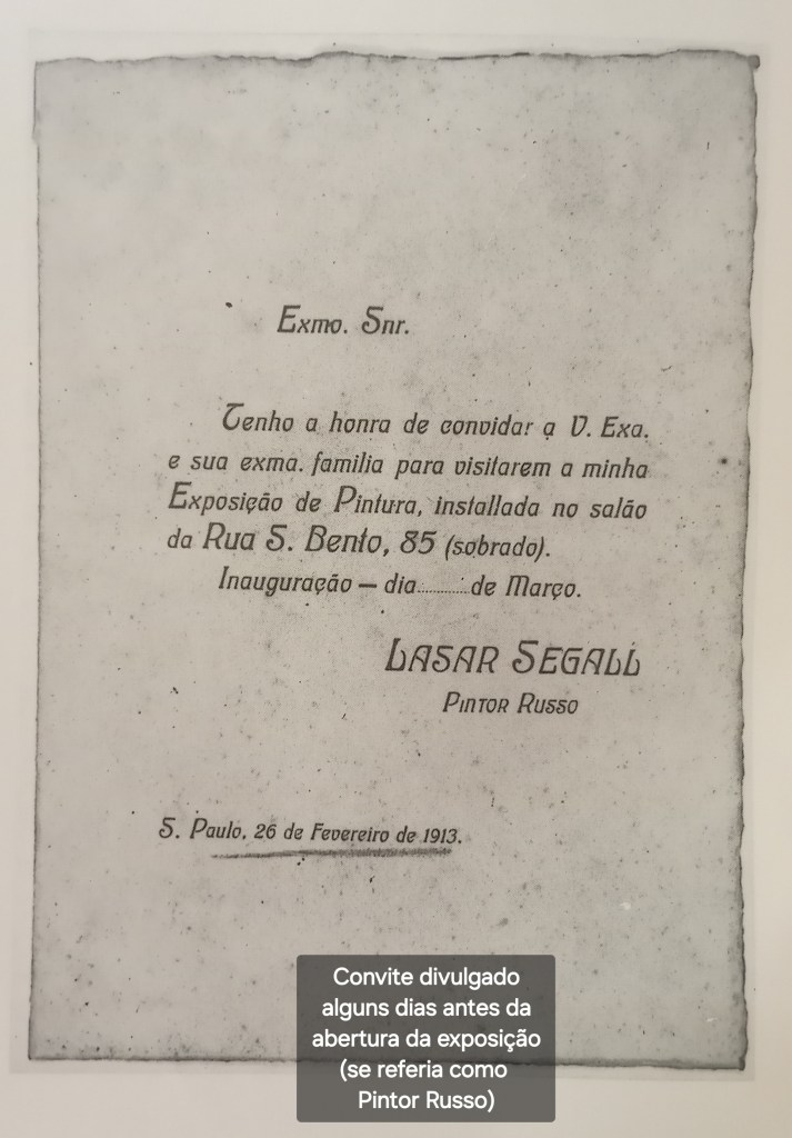 Freitas Valle muito bem relacionado, conseguiu o espaço para que Segall realizasse sua primeira Mostra no Brasil. Um Salão térreo no prédio (Sobrado) na Rua São Bento, 85. A Exposição foi inaugurada dia 03 de Março de 1913, é considerada a “célebre PRIMEIRA MOSTRA DE ARTE MODERNA NO BRASIL.
