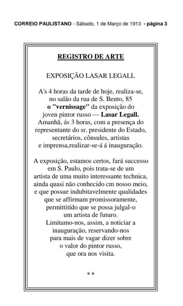 Pela primeira vez o público brasileiro vinha a conhecer “presencialmente “a arte (moderna) expressionista europeia. Entretanto a repercussão junto ao público e à crítica foi mínima, com algumas notas publicadas nos jornais paulistanos. OBS:- No anúncio de 01/03/1913 o jornal escreve “grafia do nome” errada, Lasar Legall, invés de Lasar Segall. (Abaixo).