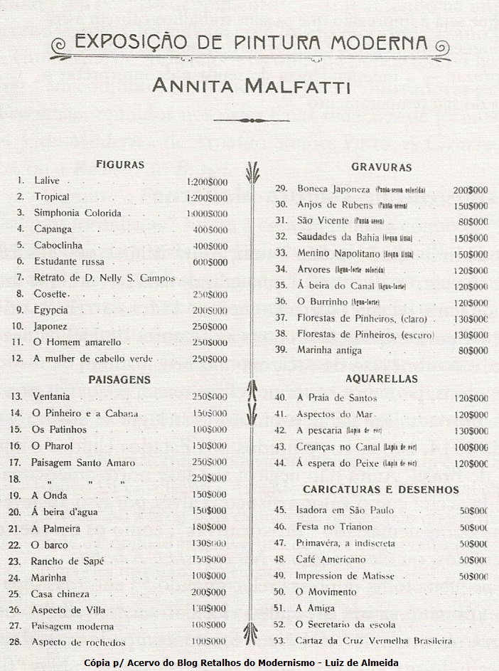 👆🏼 Annita escolheu 53 obras entre pinturas, Gravuras, Aquarelas e Desenhos de sua autoria, juntamente com desenhos a carvão de alguns colegas artistas Norte-americanos da época em que frequentou a Independent School of Art entre 1915 e 1916.