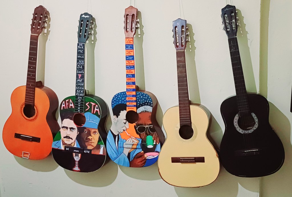 Com seus corpos recuperados, os Violões são costumizados com imagens dos Mesres da MPB, tornando-se objetos artisticos decorativos (alguns em condições para voltar a função de instrumento musical).
