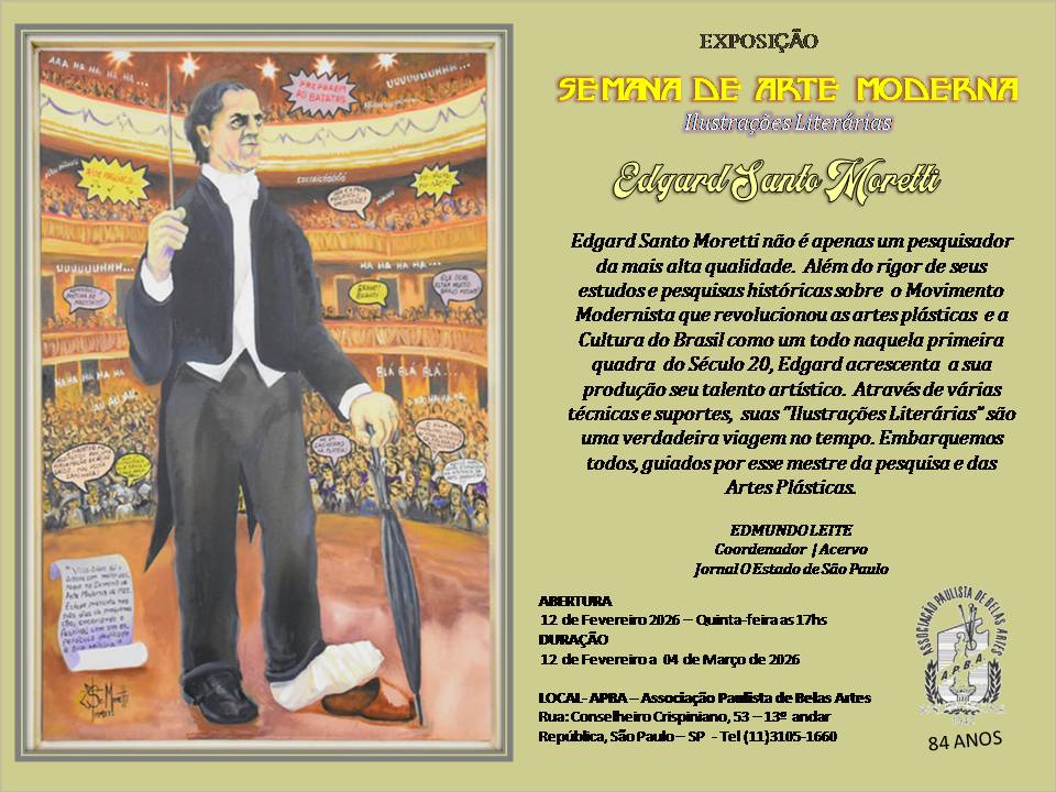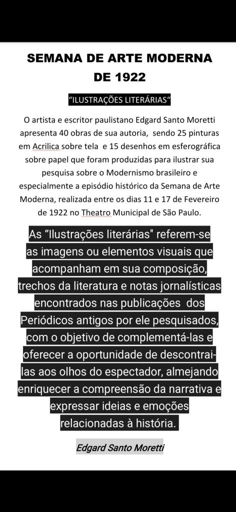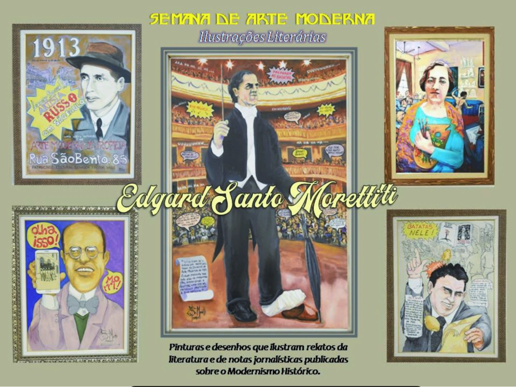 Edgard Santo Moretti não é apenas um pesquisador da mais alta qualidade. Além do rigor de seus estudos, pesquisas históricas sobre o Movimento Modernista que revolucionou as artes plásticas e a Cultura do Brasil como um todo naquela primeira quadra do Século 20, Edgard acrescenta à sua produção intelectual o seu talento artístico. Talento que não quer apenas mostrar seus múltiplos saberes e dotes artísticos, mas sim compartilhar com todos o seu encantamento com as obras de arte e o contexto, o tempo e os lugares em que foram originalmente produzidas. Através de várias técnicas e suportes, suas “Ilustrações Literárias” são uma verdadeira viagem no tempo. Embarquemos todos, guiados por esse mestre da pesquisa e das artes plásticas.