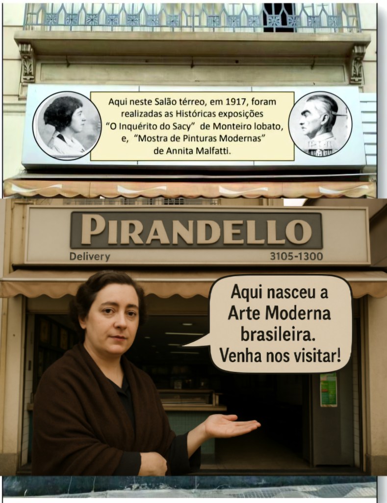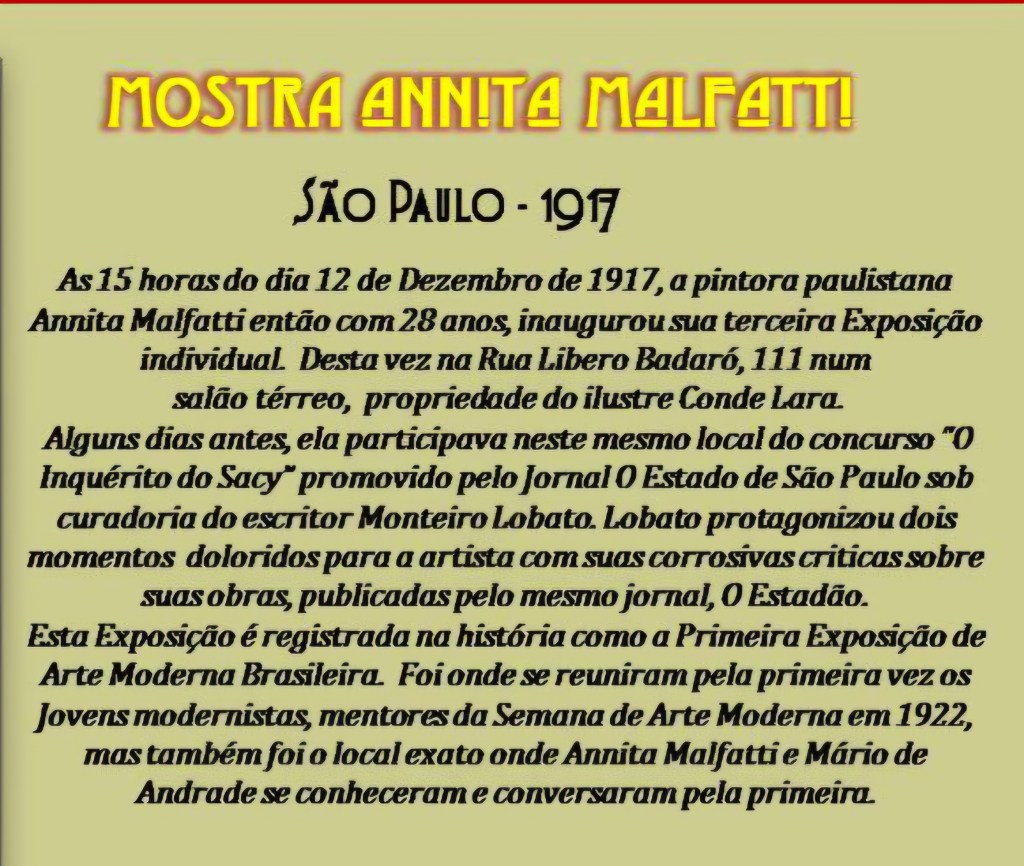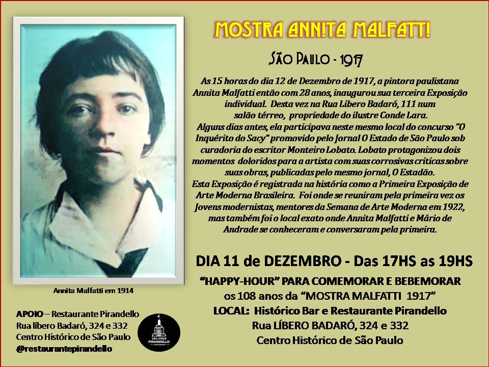 As 15hs do 12 de Dezembro de 1917, Annita Malfatti inaugurava sua “polêmica EXPOSIÇÃO DE PINTURAS MODERNAS” na Rua Líbero Badaró, 111 onde hoje se instala o Bar e Restaurante São Jorge Pirandello. A Mostra entrou para a História como a Primeira Exposição de Arte Moderna brasileira.