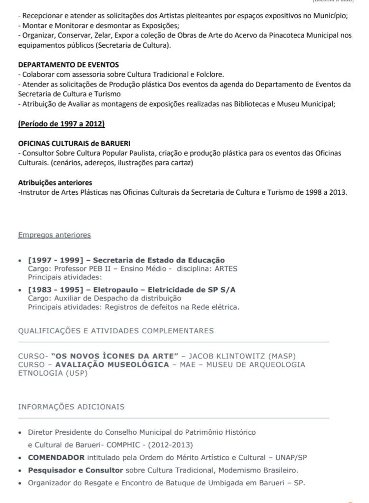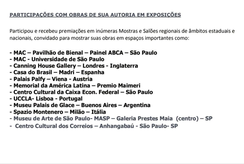 “… Para fundamentar a criação Plástica, busquei no Folclore Brasileiro, na Cultura Tradicional Paulista e na História (especialmente no Modernismo) os conteúdos que possibilitam materializar minhas obras.